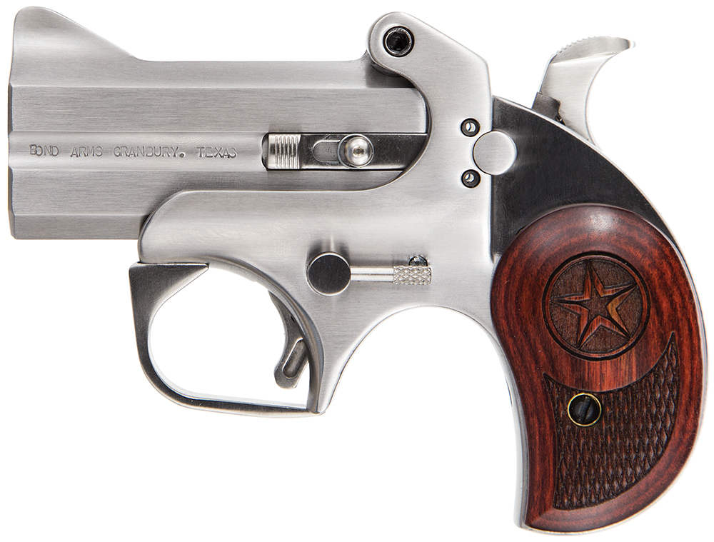 The Texas Defender by Bond Arms is a derringer available in 45 Colt (LC)/410 gauge and compatible with all Bond Arms interchangeable barrels. The Texas Defender features a cross-bolt safety and rosewood grips. The trigger guard aids in the control of the pistol when shooting larger calibers, and the spring-loaded cammed locking lever allows for a tighter barrel/frame fit and rapid loading and unloading.